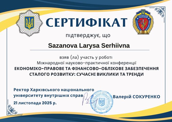 Курсантки другого курсу ННІ №1 Анастасія МІРОШНИЧЕНКО, Олександра ПАВЛЮК, Алевтина ШТОГРІНА, курсант 4 курсу ННІ №4 Володимир ЛІСОВОЛ та їх викладачки – доцентка кафедри мовної підготовки Вікторія ФИЛИПСЬКА і старша викладачка цієї ж кафедри Лариса САЗАНОВА – взяли участь у Міжнародній науково-практичній конференції «Економіко-правове та фінансово-облікове забезпечення сталого розвитку: сучасні виклики та тренди», проведеній Харківським національним університетом внутрішніх справ.