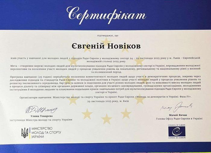 У Львові відбулося «Навчання для молодих людей з підходів Ради Європи у молодіжному секторі», у якому взяв участь курсант 2 курсу навчально-наукового інституту №2 Харківського національного університету внутрішніх справ Євген НОВІКОВ.