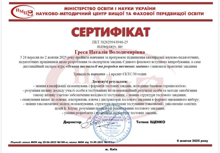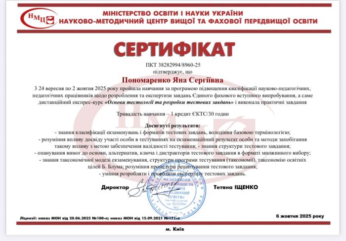У межах отриманих компетентностей та подальшої роботи кафедри викладачки вже розробили сучасну базу тестових завдань для ЄФВВ «Психологія та соціологія», що відповідає вимогам МОН України, міжнародним стандартам тестології та принципам академічної доброчесності. Це підсилює методичний потенціал кафедри та сприяє якісному оцінюванню результатів навчання.