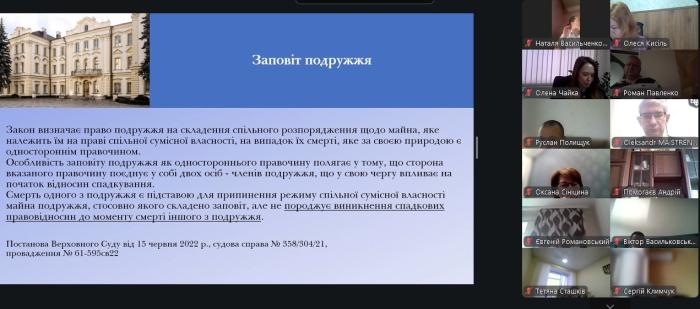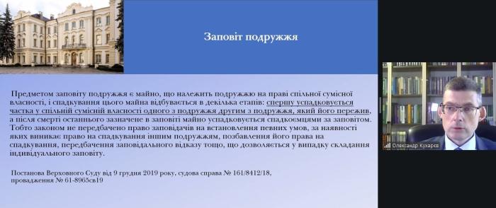 Професор кафедри цивільного права та процесу навчально-наукового інституту №5, тренер Національної школи суддів України Олександр КУХАРЄВ прочитав лекцію та тему «Сучасні тенденції спорів про визнання заповітів недійсними» для суддів місцевих загальних судів. Особливу увагу він акцентував на питаннях правових наслідків складення спільного заповіту подружжя, а також окремим підставам недійсності заповітів – невідповідність волі та волевиявлення заповідача, порушення форми та порядку посвідчення.