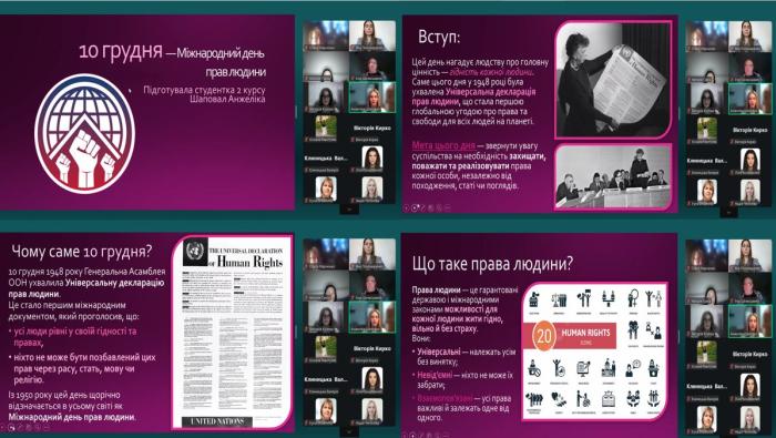 Окрему увагу приділили Міжнародному дню прав людини, який традиційно відзначається 10 грудня та символічно завершує глобальну правозахисну кампанію. Обговорення дозволило студентам зосередитися на актуальних викликах у сфері дотримання прав людини в Україні та світі, а також проаналізувати психологічні механізми, які лежать в основі правозахисної діяльності.