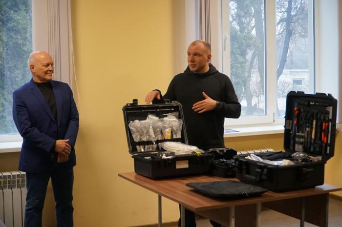 Здобувачам освіти продемонстрували універсальну криміналістичну валізу (вагою близько 15 кг), яка використовується під час огляду місць учинення злочинів, а також спеціальну – призначену для пошуку й відбору біологічних слідів. Окремо показали дрон для огляду великих територій.