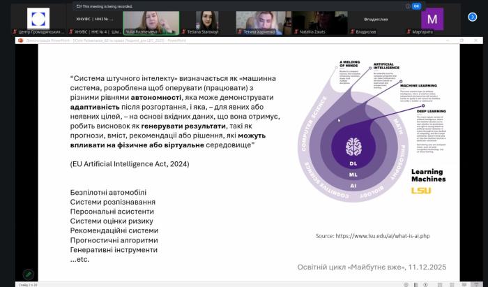 Курсанти навчально-наукового інституту № 4 долучилися до онлайн-лекції «Штучний інтелект та права людини», яку провела дослідниця права та ШІ Юлія РАЗМЄТАЄВА. Під час заходу відбулося обговорення актуального питання – як алгоритми ШІ впливають на можливості, рівність і безпеку людей, а також чому системи штучного інтелекту можуть відтворювати упередження.