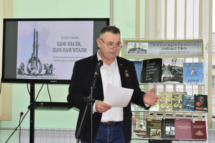 Молодь почула спогади безпосередніх учасників ліквідації катастрофи та дізналася про героїчну працю ліквідаторів, які, ризикуючи власним життям і здоров’ям, зупинили некеровану ядерну реакцію. Учасники також ознайомилися з книжковою виставкою «Вони врятували людство».