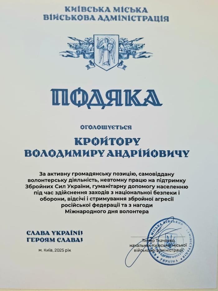 Професора кафедри цивільного права та процесу навчально-наукового інституту №5 Володимира КРОЙТОРА з нагоди Міжнародного дня волонтера та за активну громадянську позицію відзначено подякою начальника Київської міської військової адміністрації Тимура ТКАЧЕНКА.