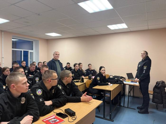 Олена ГОРБАНЬ акцентувала увагу на важливому значенні Національної поліції у захисті, охороні та відновленні прав і свобод громадян, а також у забезпеченні правопорядку в державі, зокрема в умовах дії правового режиму воєнного стану. Крім того, вона ознайомила здобувачів освіти із практикою внутрішнього моніторингу дотримання конституційних прав і свобод у діяльності органів та підрозділів Національної поліції, який здійснюється інспекторами Департаменту головної інспекції та дотримання прав людини.