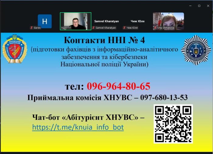 Він розповів про актуальні загрози у цифровому середовищі, перспективи розвитку кібербезпеки, можливості навчання у ХНУВС, детально зупинився на проєктах НДЛ. Учасники отримали вичерпні відповіді на запитання щодо вступу, особливостей освітнього процесу та подальшого працевлаштування. Особливу увагу було приділено практичним аспектам роботи в сфері інформаційної безпеки, необхідним навичкам та вимогам до фахівців, які планують будувати кар’єру в цій галузі.