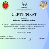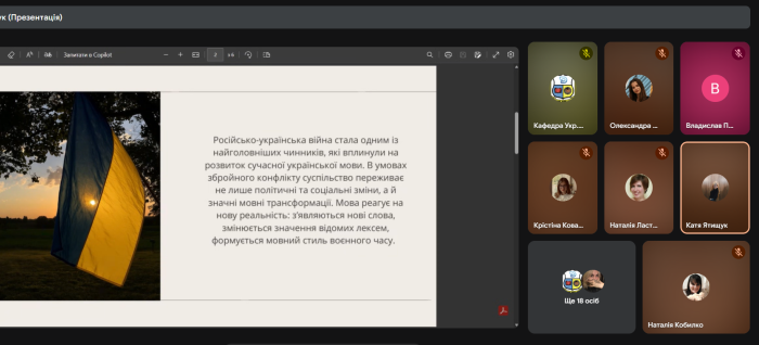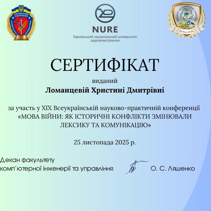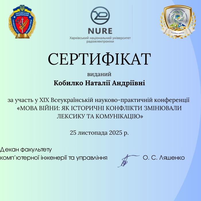 Члени наукового гуртка «Актуальні проблеми українознавства» під керівництвом доцентки кафедри гуманітарних дисциплін та українознавства Наталії Кобилко долучилися до роботи ХІХ Всеукраїнської науково-практичної конференції «Мова війни: як історичні конфлікти змінювали лексику та комунікацію». Захід відбувся в Харківському національному університеті радіоелектроніки. У фокусі уваги дослідників були теми впливу війни на формування нової української термінології, інформаційних війн і мовних стратегій у медіа.