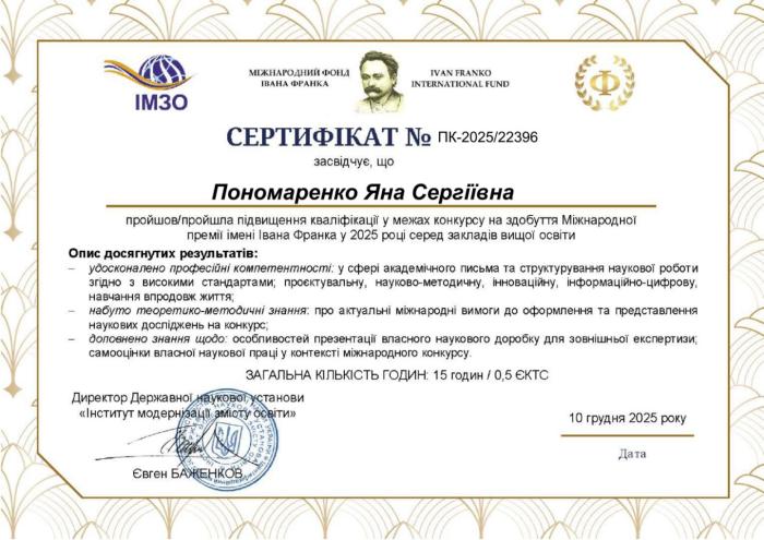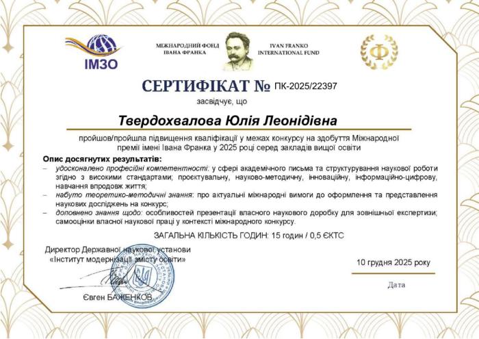 Участь у конкурсі була зарахована як підвищення кваліфікації науково-педагогічних працівників відповідно до чинних вимог. Отримана відзнака підтверджує високий науковий рівень дослідження, актуальність тематики та вагомий внесок учених ХНУВС у розвиток сучасної української науки, зокрема у вивчення психологічних наслідків війни та підтримку суспільної стійкості в умовах воєнного часу.