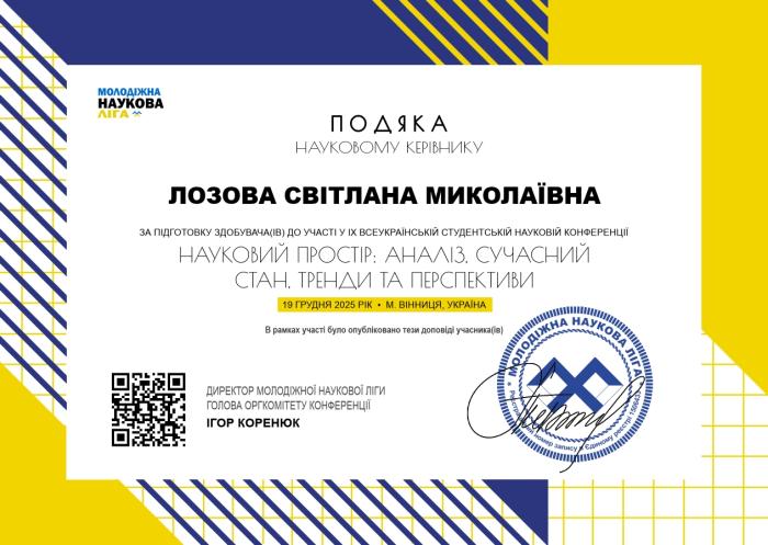 Наукова керівниця здобувачки – кандидатка психологічних наук, доцентка, доцентка кафедри кримінального процесу, криміналістики та експертології ННІ №5 Світлана Лозова – отримала подяку за якісну підготовку учасниці до заходу.