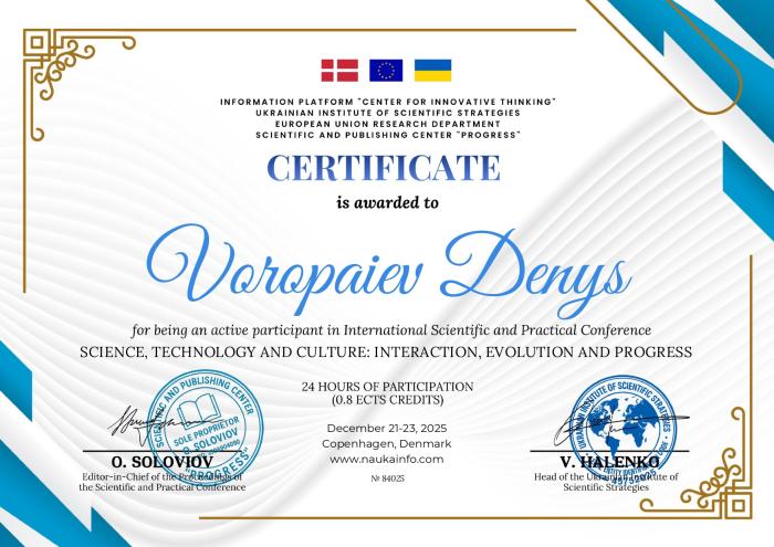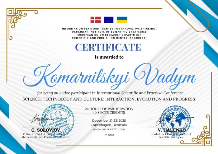 Курсанти навчально-наукового інституту №4 – Денис Воропаєв, Вадим Комарніцький, Максим Сітало та Олександр Рудик – стали активними учасниками міжнародної науково-практичної конференції «SCIENCE, TECHNOLOGY AND CULTURE: INTERACTION, EVOLUTION AND PROGRESS». Свої наукові роботи вони підготували під фаховим керівництвом доцента кафедри мовної підготовки Олега Гончарука, рекомендації та настанови якого сприяли досягненню належного теоретичного рівня представлених робіт. Захід було організовано в місті Копенгаген (Королівство Данія) у форматі заочної інтернет-конференції за підтримки Українського інституту наукових стратегій. У межах своїх доповідей молоді науковці дослідили актуальні виклики та динаміку змін у сферах технологій і культури сучасного світу.