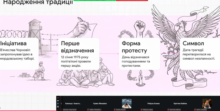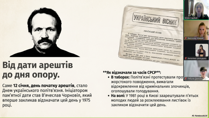 Куратори навчально-наукового інституту №5 провели виховні години зі здобувачами вищої освіти до Дня українського політв'язня. З 12 січня 1975 року за ініціативи В'ячеслава Чорновола в державі вшановується пам’ять українців, які зазнали переслідувань, ув’язнення та репресій за свої переконання, громадянську позицію та боротьбу за свободу й незалежність України. Студенти ознайомилися з історією виникнення цієї пам’ятної дати, дізналися про долі українських політв’язнів різних історичних періодів і виклики, які долали борці за незалежність України. Разом з кураторами здобувачі вищої освіти обговорили важливість усвідомлення цінності свободи, поваги до прав і свобод людини та відповідальності за майбутнє держави.