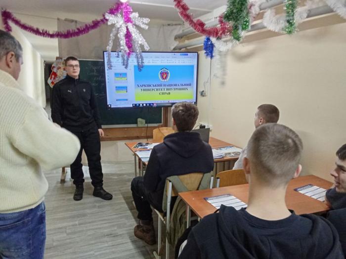 Для учнів державного ліцею з посиленою військово-фізичною підготовкою «Слобожанський» відбувся профорієнтаційний захід із курсантом першого курсу навчально-наукового інституту №4 В’ячеславом Дугою – випускником цього закладу освіти.
