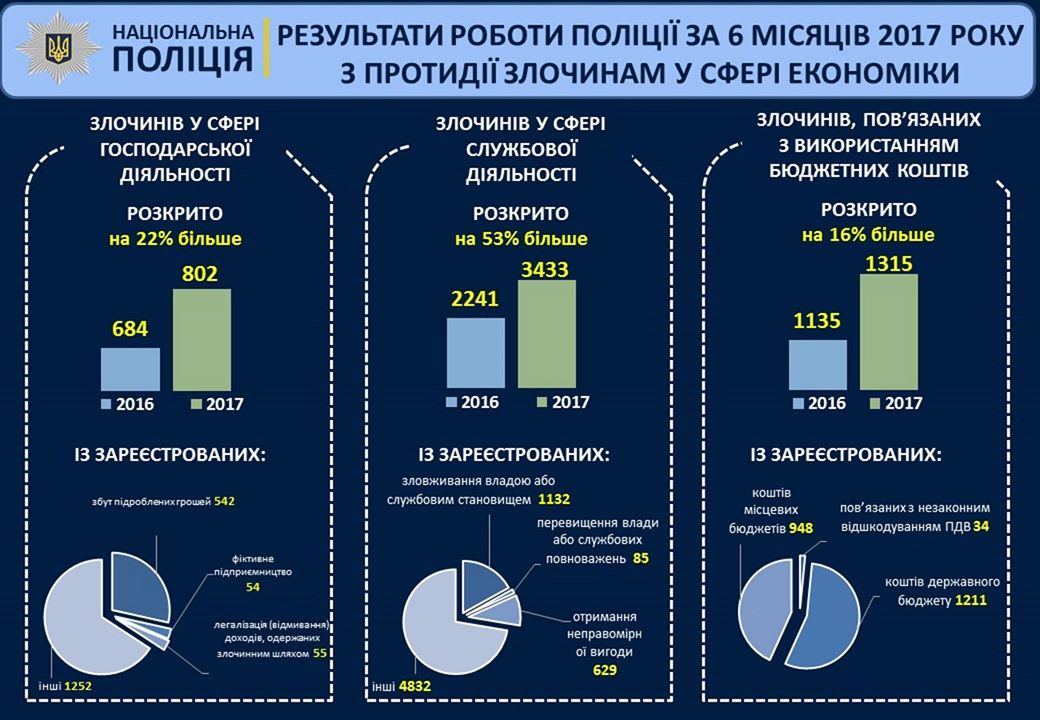 Арсен Аваков підкреслив, що позитивна динаміка спостерігається і у захисті економіки. Так, за пів року зростання рівню розкриття злочинів у сфері господарської діяльності становить 22%, у сфері службової діяльності – 53%, у сфері використання бюджетних коштів – 16%.