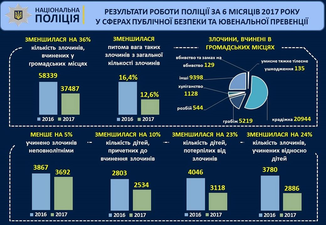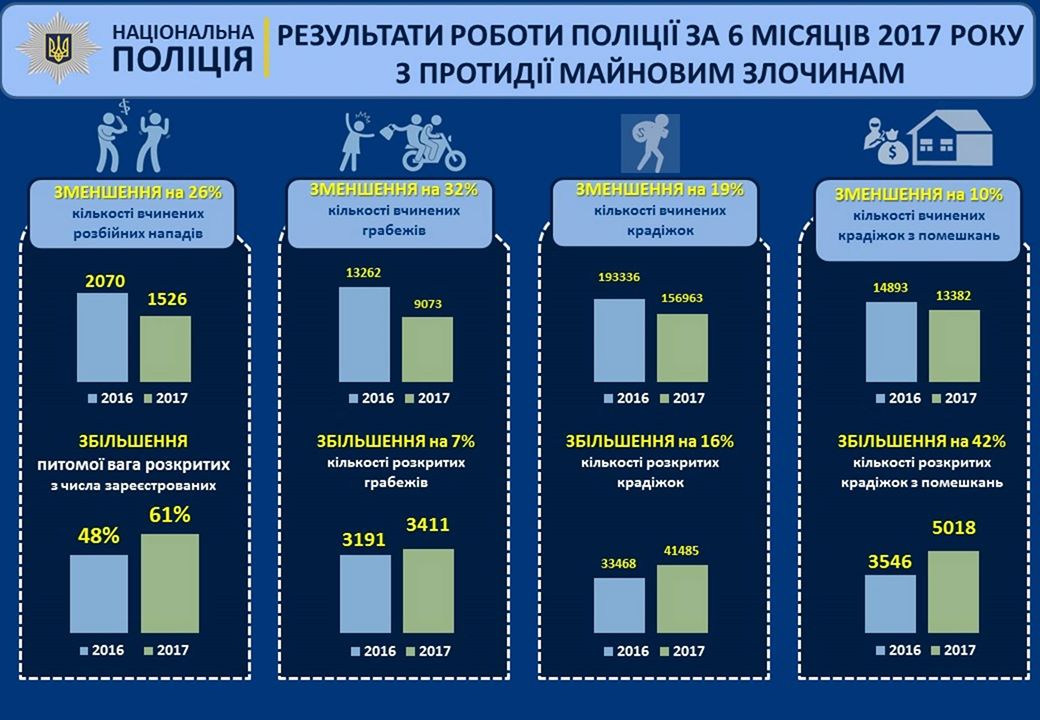 Зниження рівня злочинності по групам злочинів становить від 10% до 22% – у порівнянні з аналогічним періодом 2016 року. Про це заявив міністр внутрішніх справ Арсен Аваков, підсумовуючи роботу Національної поліції.