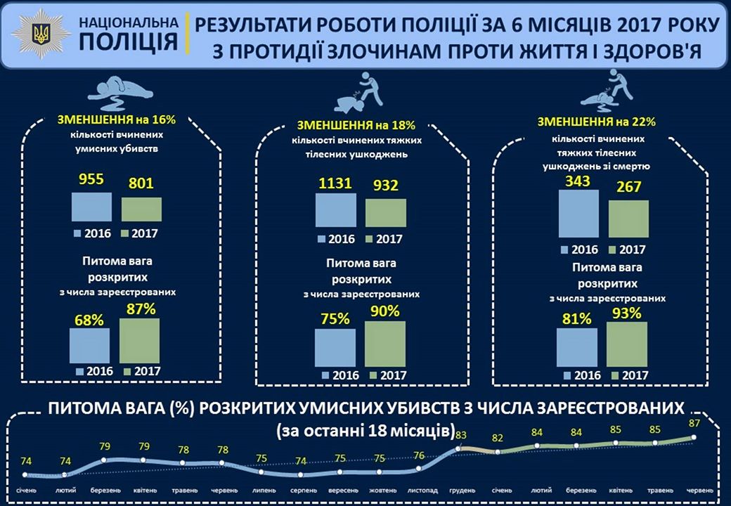 Міністр зазначив, що у сфері особливо тяжких злочинів проти життя і здоров'я людей рівень розкриття злочинів становить від 87% по умисним вбивствам до 93% – нанесення тяжких тілесних злочинів.