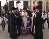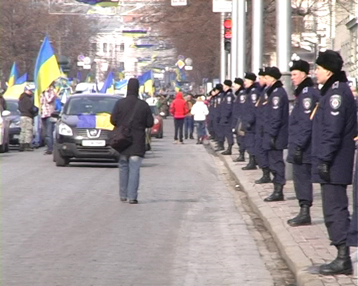 Після невеликого мітингу біля пам’ятника Тарасу Григоровичу Шевченку з квітами, прапорами і портретами героїв харків’яни у супроводі оркестру і колони автомобілів Автомайдану рушили по вулиці Сумській до площі Конституції, щоб іще раз продемонструвати усім: Схід і Захід – разом; народ України – єдиний.