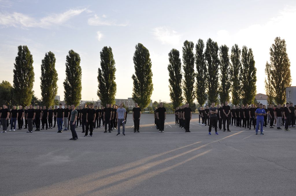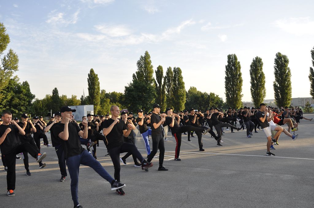 Перший день табірного збору для першокурсників Харківського національного університету внутрішніх справ розпочався ранковою зарядкою, яку провів доцент кафедри спеціальної фізичної підготовки Андрій Забора. Слід зазначити, що фізичній підготовці майбутніх працівників поліції в університеті приділяється велика увага.