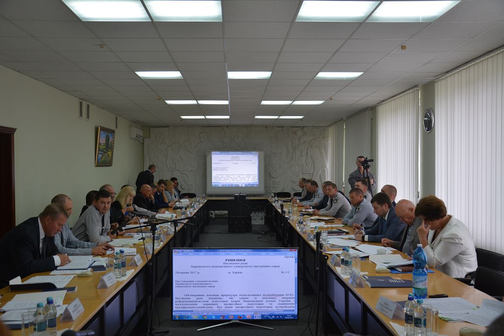 Із питанням про діяльність колективу університету щодо відзначення 100-річчя від початку підготовки охоронців правопорядку в Харкові виступив перший проректор навчального закладу підполковник поліції Дмитро Швець. Члени Наглядової ради прийняли рішення підтримати ініціативу трудового колективу та ректорату університету щодо заохочення кращих працівників і ветеранів університету керівництвом міста Харкова, Харківської області, Міністерства внутрішніх справ України та держави у зв’язку з ювілеєм; сприяти зміцненню матеріальної бази університету, необхідної для успішної реалізації зазначених заходів; провести роботу щодо інформування населення про сторічний ювілей підготовки правоохоронців у Харкові, а також взяти участь у науково-практичній конференції «Підготовка охоронців правопорядку в Харкові: 100 років історії (1917–2017 рр.)» та урочистостях трудового колективу університету з нагоди ювілею.