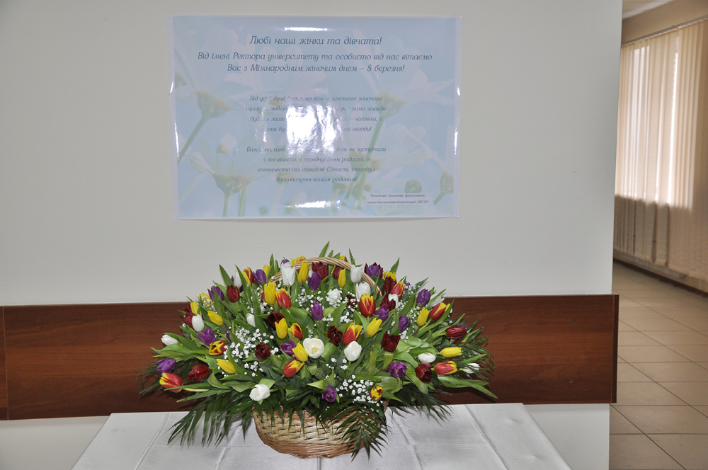 Величезним букетом квітів чоловічий колектив факультету права і масових комунікацій від себе та від імені ректора університету поздоровив усіх представниць прекрасної статі з чудовим весняним святом – 8 Березня. Чарівні квіти – це перше, що бачать жінки, коли входять у фойє факультету, а теплі слова вітання додають гарного настрою та душевного комфорту усім оточуючим.