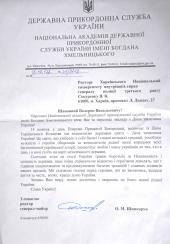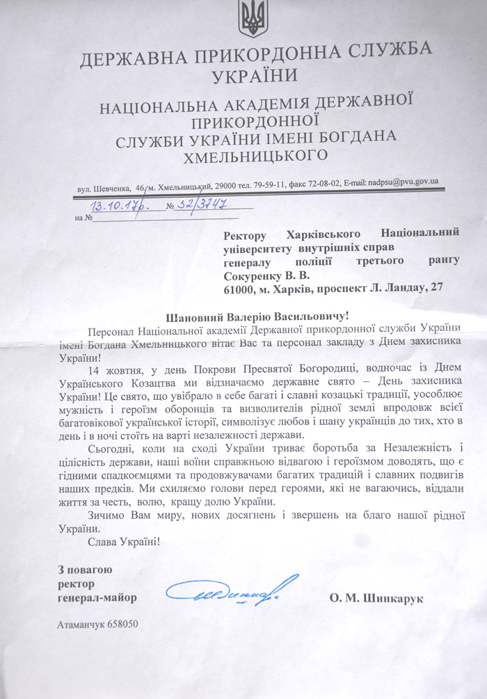 На ім’я ректора Харківського національного університету внутрішніх справ генерала поліції третього рангу Валерія Сокуренка надійшов лист від ректора Національної академії Державної прикордонної служби України імені Богдана Хмельницького генерал-майора Олега Шинкарука з привітанням з нагоди державного свята Дня захисника України.
