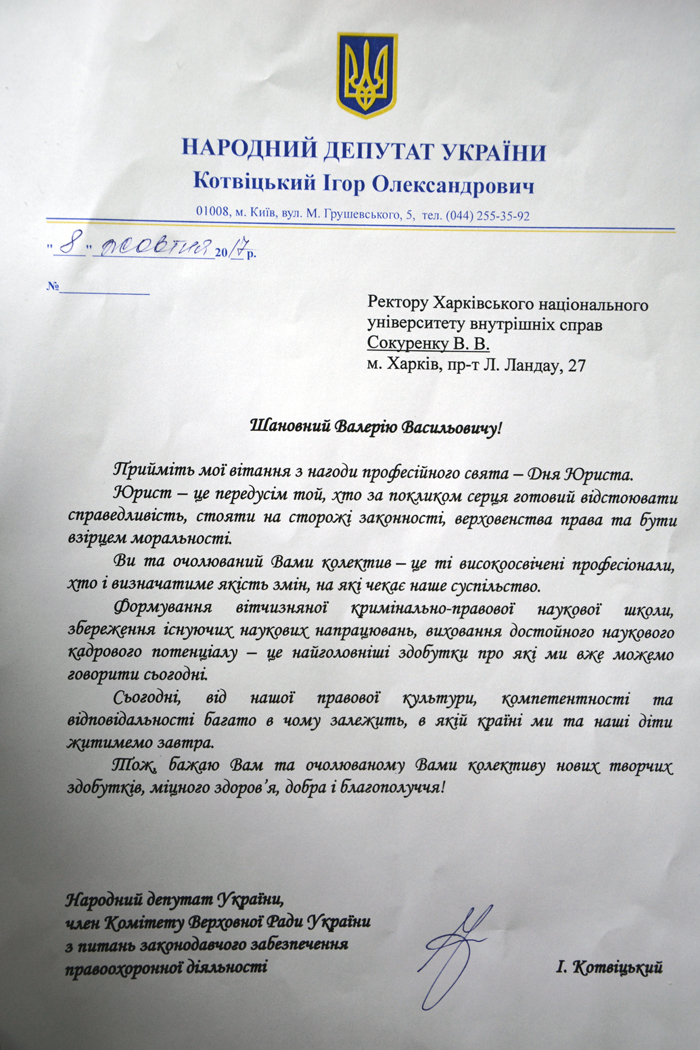 Народний депутат України, член Наглядової ради Ігор Котвіцький привітав колектив Харківського національного університету внутрішніх справ з професійним святом – Днем юриста: «Юрист – це передусім той, хто за покликом серця готовий відстоювати справедливість, стояти на сторожі законності, верховенства права та бути взірцем моральності.