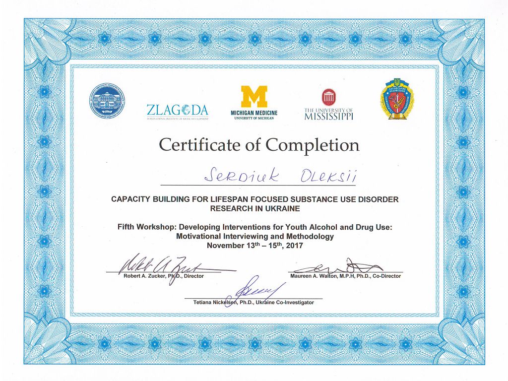 Заступник завідувача Науково-дослідної лабораторії з проблем протидії злочинності Харківського національного університету внутрішніх справ підполковник поліції Олексій Сердюк взяв участь у міжнародному україно-американському науково-практичному семінарі програми фонду Фогерті з розвитку досліджень хімічної залежності в Україні «Capacity building for lifespan focused substance use disorder research in Ukraine. Fifth Workshop: Developing Interventions for Youth Alcohol and Drug Use: Motivational Interviewing and Methodology», який відбувся у м. Львів.