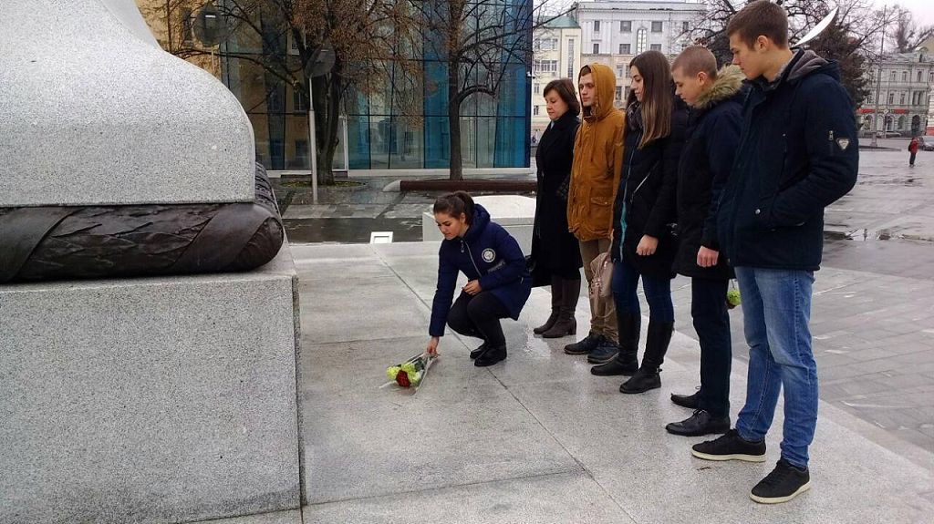 Курсанти групи Ф–2–102 разом із куратором доцентом кафедри соціальних та економічних дисциплін Вікторією Гончаровою з нагоди відзначення Дня Гідності та Свободи поклали квіти до пам’ятника Незалежності, розташованому на площі Конституції. Також представники університету вшанували пам'ять учасників АТО, які віддали свої життя, відстоюючи свободу та незалежність України, та поклали квіти до їх фотографій.