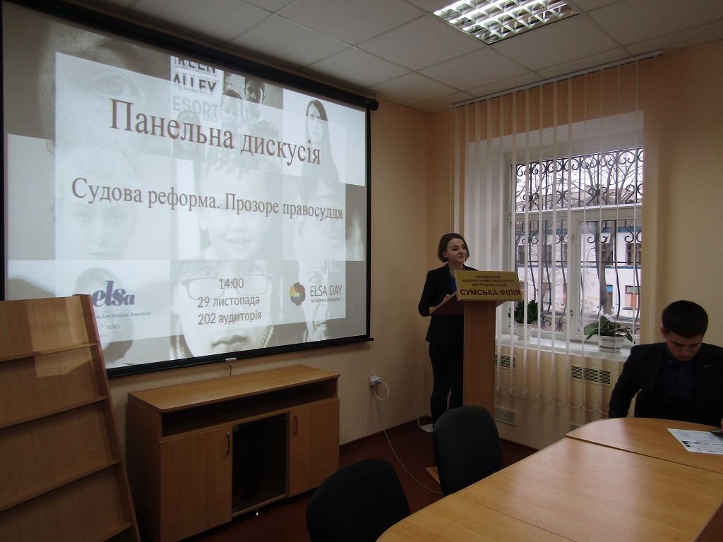 У рамках заходів, присвячених святкуванню ELSA Day Сумським осередком ELSA (Європейська Асоціація Студентів Права), який функціонує на базі Сумської філії Харківського національного університету внутрішніх справ, було проведено панельну дискусію «Судова реформа. Прозоре правосуддя».