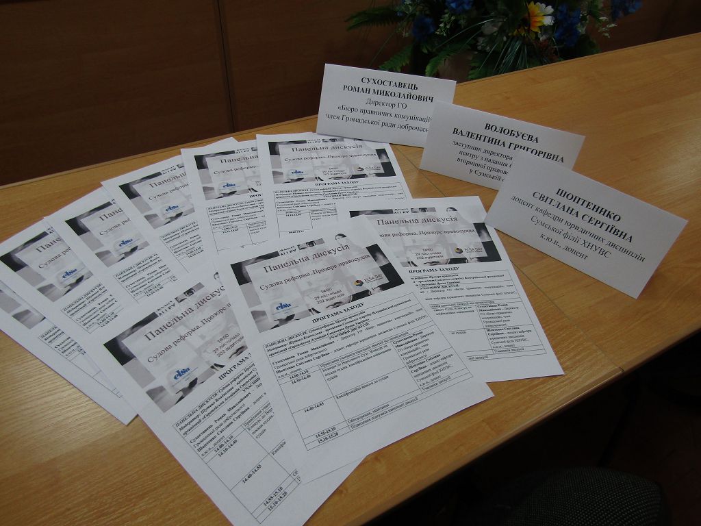 До дискусії долучилися директор ГО "Бюро правничих комунікацій", член Громадської ради доброчесності Роман Сухоставець, доцент кафедри юридичних дисциплін Сумської філії ХНУВС Світлана Шоптенко та заступник директора Регіонального центру з надання безоплатної вторинної правової допомоги у Сумській області Валентина Волобуєва. Присутніми було розглянуто питання конкурсу до Верховного Суду, конкурсу на посади суддів, кваліфікаційного оцінювання суддів та кваліфікаційні вимоги до суддів.