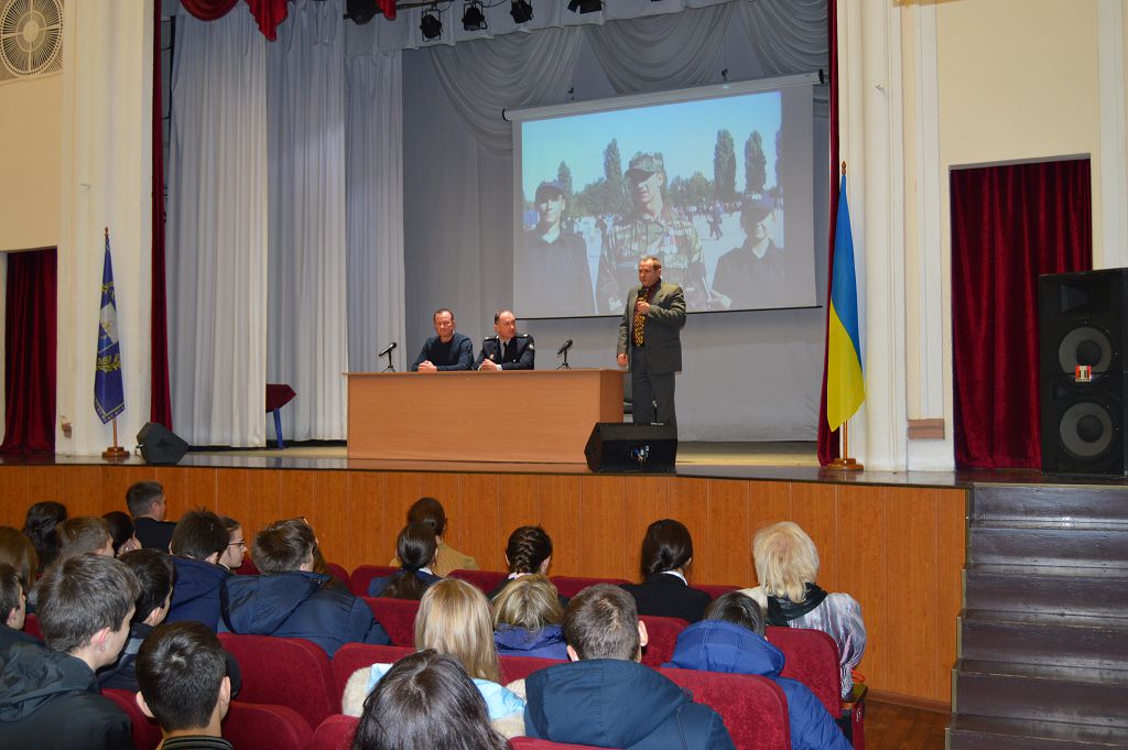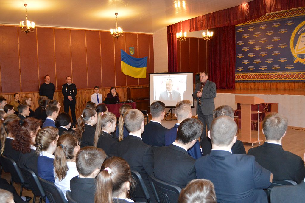 Старший інспектор відділу комплектування Управління кадрового забезпечення ГУНП в Донецькій області майор поліції Олена Шевченко розповіла школярам про порядок звернення до відділів поліції за місцем проживання бажаючих вступати до Харківського національного університету внутрішніх справ для початку процесу формування навчальних справ.