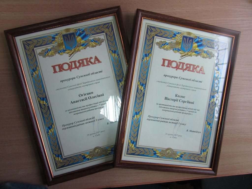За креативність та професійний підхід під час підготовки творчої роботи «7 кроків до покращення роботи прокурора» прокурор Сумської області Віталій Матвійчук нагородив подякою прокурора Вікторію Колос та Анастасію Огієнко.