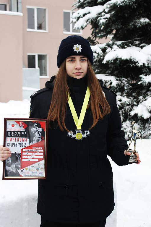 Бронзову нагороду за ІІІ місце у Всеукраїнському турнірі з гирьового спорту YOD 2 Дмитро Швець вручив курсанту І курсу факультету № 2 Килипко Альоні, яка стала призером у ривку гирі вагою 16 кг.