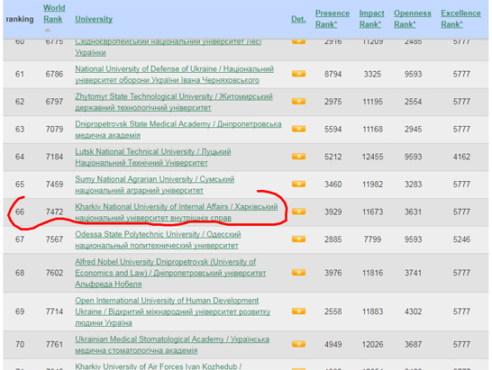 В цілому ЗВО із специфічними умовами навчання, які входять до системи МВС України, за даними рейтингу Webometrics Ranking Web of Universities, посіли такі місця серед 327 національних закладів: