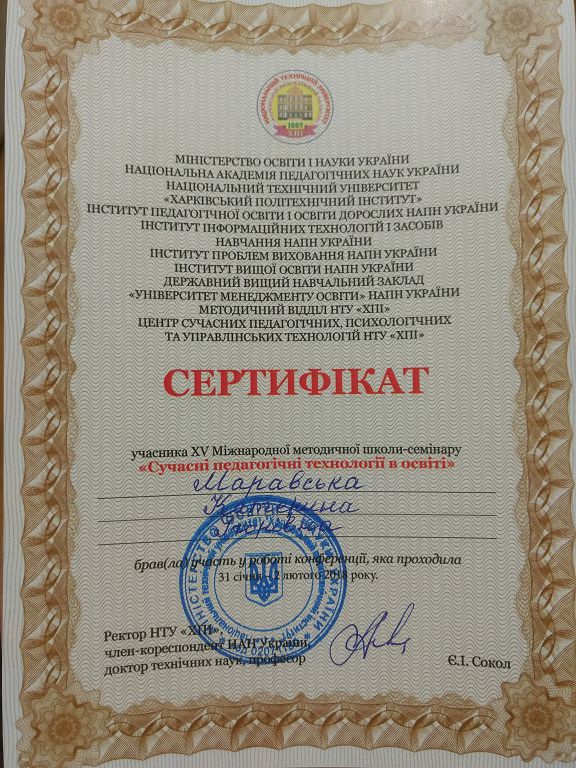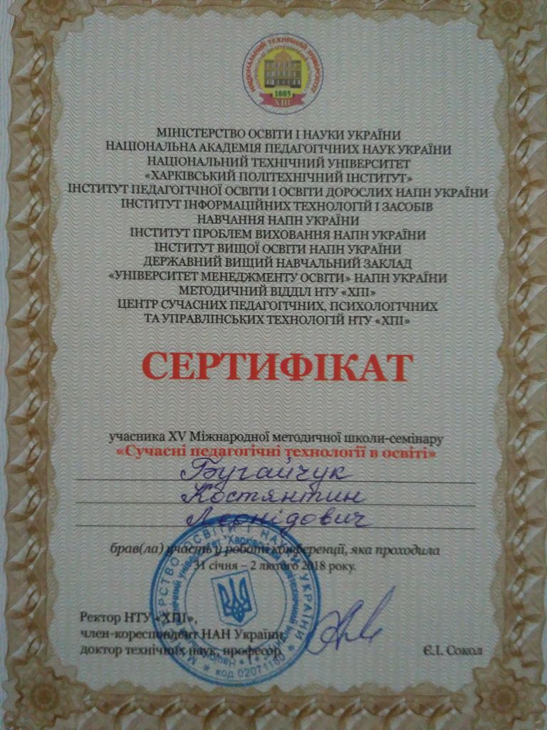 Завідувач науково-дослідної лабораторії з проблем протидії злочинності Харківського національного університету внутрішніх справ Костянтин Бугайчук та провідний фахівець відділення впровадження іноваційних методик навчання відділу методичного забезпечення навчального процесу Катерина Маравська відвідали серію майстер-класів в рамках Міжнародної школи-семінару «Сучасні педагогічні технології в освіті», що проходила на базі Національного технічного університету «Харківській політехнічний інститут» та отримали відповідний сертифікат.