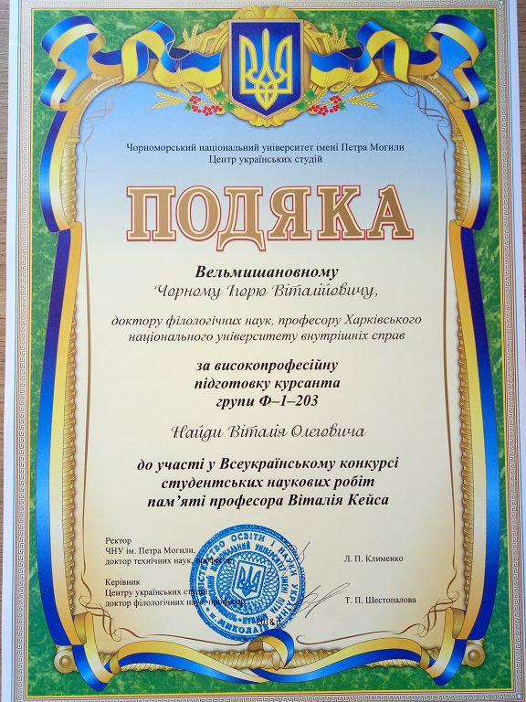 Цього року Харківський національний університет внутрішніх справ уперше взяв участь у конкурсі наукових робіт філологічного спрямування. Курсант факультету № 1 Віталій Найда написав розвідку, присвячену історії та сучасності Харківської школи фантастики. Цю роботу, подану на Всеукраїнський конкурс студентських наукових робіт пам’яті професора Віталія Кейса, що проводився Чорноморським національним університетом імені Петра Могили, було відзначено Дипломом. Подяку отримав і науковий керівник курсанта, завідувач кафедри українознавства факультету № 2 професор Ігор Чорний за високопрофесійну підготовку учня до участі у конкурсі.