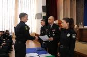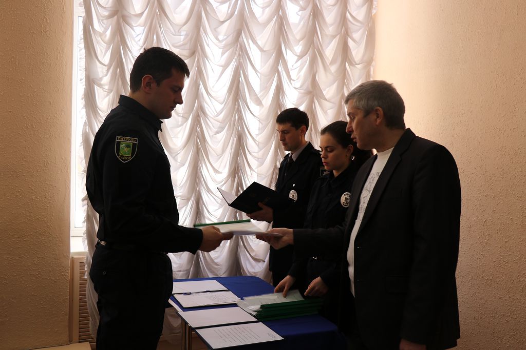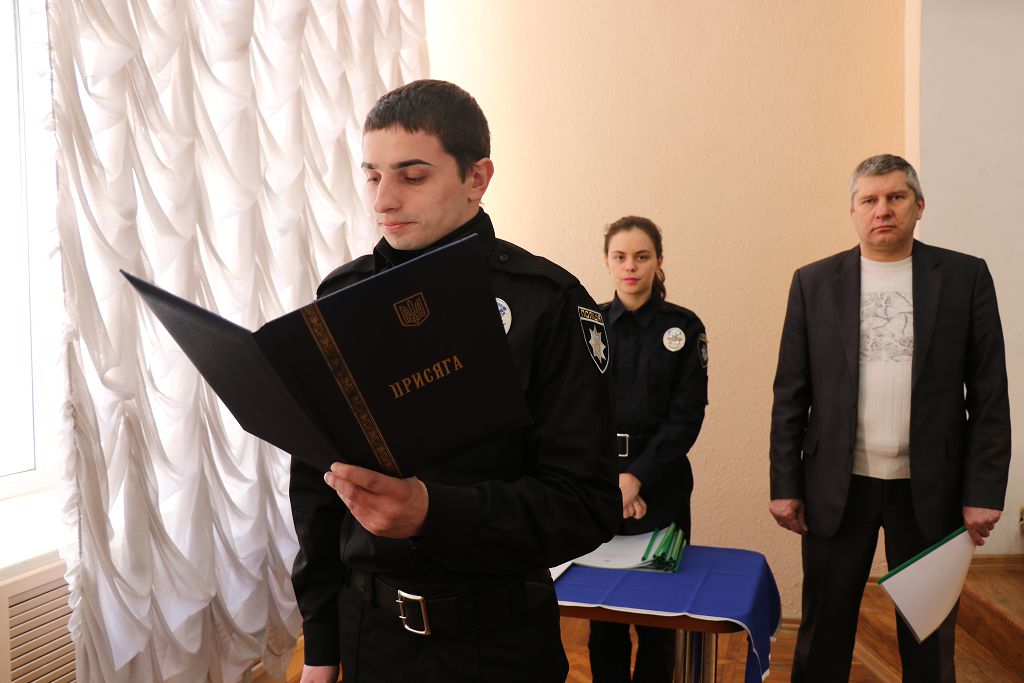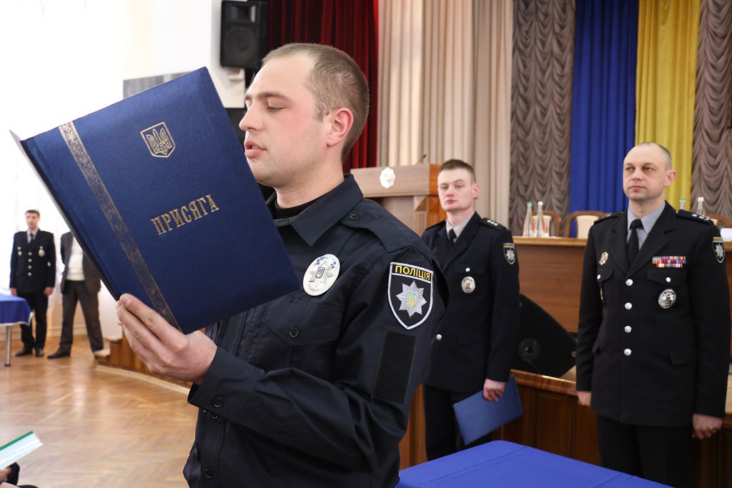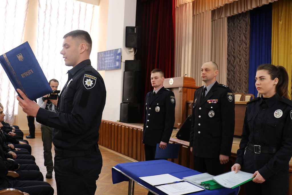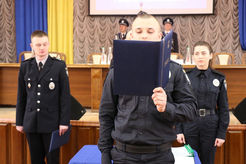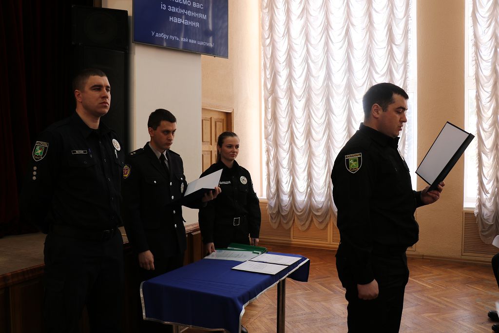 Перший проректор навчального закладу підполковник поліції Дмитро Швець та начальник Управління патрульної поліції у м. Харків Департаменту патрульної поліції старший лейтенант поліції Олексій Ніколаєв привели до Присяги працівника поліції та урочисто вручили довідки про успішне закінчення первинної професійної підготовки.