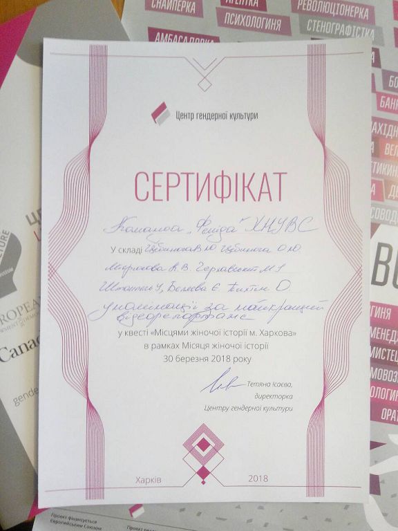 Представники Харківського національного університету внутрішніх справ курсанти факультету № 1 Олена Цебинога, Вікторія Цебинога, Олександр Пихтін, Уляна Штомпель, слухач магістратури Мар'ян Черхавський, курсант факультету № 2 Карина Мікрюкова та курсант факультету № 4 Єлізавета Бєляєва під керівництвом Юлії Заболотної – голови Наукового товариства студентів, курсантів, слухачів, аспірантів, ад`юнктів, докторантів і молодих вчених взяли участь у квесті «Вулицями жіночої історії».