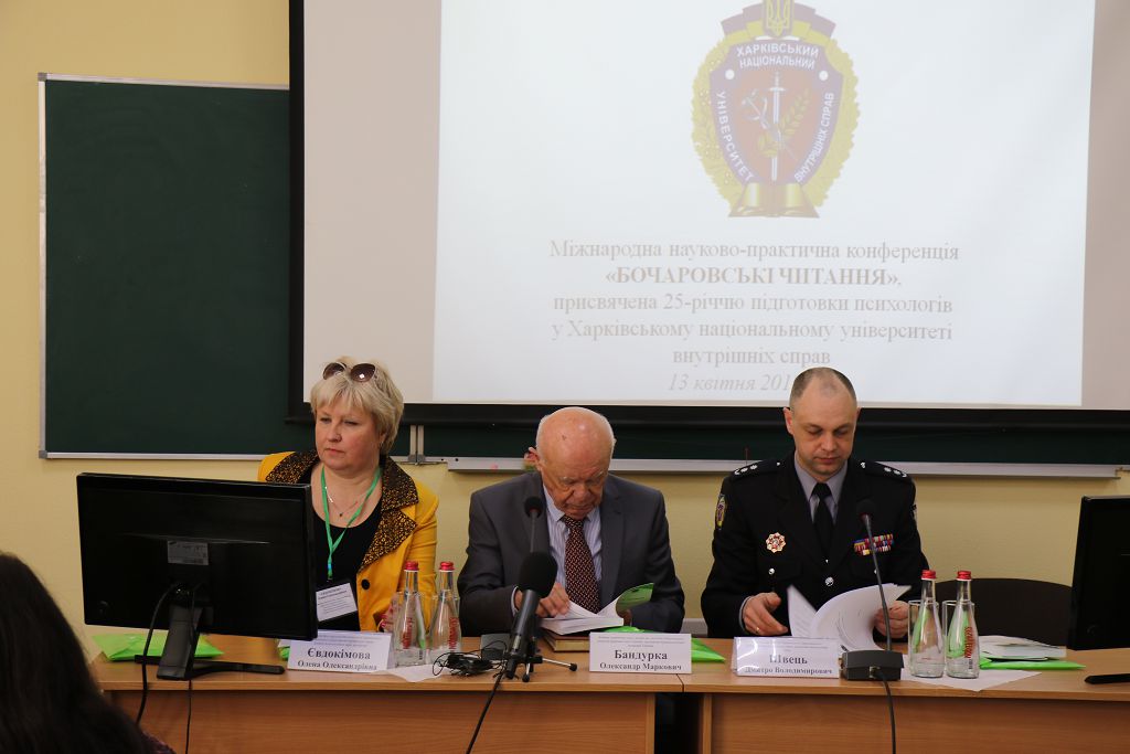 У Харківському національному університеті внутрішніх справ відбулася Міжнародна науково-практична конференція, присвячена 25-річчю підготовки психологів у ХНУВС, а також з нагоди 90-річчя професора С. П. Бочарової. На конференції зібралися представники вищих навчальних закладів, науковці, практичні психологи, слухачі, аспіранти, докторанти, ад’юнкти, магістри. Cеред провідних вітчизняних психологів у заході взяли участь доктор юридичних наук, професор, академік Національної академії правових наук України, президент Кримінологічної асоціації України Олександр Бандурка, доктор психологічних наук, професор, член-кореспондент Балтійської педагогічної академії, професор кафедри соціології та психології факультету № 6 ХНУВС Олена Землянська, доктор психологічних наук, професор, завідувач кафедри соціології та психології факультету № 6 ХНУВС Олена Євдокімова, доктор соціологічних наук, кандидат фізико-математичних наук, професор, професор кафедри соціології та психології факультету № 6 ХНУВС Микола Саппа, кандидат психологічних наук, декан факультету психології, професор кафедри прикладної психології Харківського національного університету ім. В. Н. Каразіна Надія Крейдун, доктор психологічних наук, професор, головний науковий співробітник науково-дослідної лабораторії екстремальної та кризової психології Національного університету цивільного захисту України Олександр Тімченко, доктор психологічних наук, професор, завідувач кафедри практичної психології Харківського національного педагогічного університету ім. Г. С. Сковороди Тамара Хомуленко, начальник Клініки психіатрії та наркології Військово-медичного клінічного центру Північного регіону (м. Харків), провідний психіатр В’ячеслав Заворотній та багато інших. Конференцію відкрив перший проректор університету кандидат педагогічних наук, підполковник поліції Дмитро Швець. Він привітав учасників конференції від імені ректора, доктора юридичних наук, доцента, Заслуженого юриста України, генерала поліції третього рангу Валерія Сокуренка та наголосив, що психологія – це наука, яка є необхідною для всіх галузей життєдіяльності. Проблеми, що виникають сьогодні у будь-яких сферах, потребують опрацювання фахівців, які мають професійні навички та вміння, можуть надати кваліфіковану допомогу у сфері психології. Тому ті знання, які були надані випускникам під час навчання стануть їм у пригоді у подальшій професійній діяльності. Академік Національної академії правових наук України, доктор юридичних наук, професор Олександр Бандурка зазначив: «На сьогодні психологічна забезпеченість усього процесу життєдіяльності українського суспільства особливо актуальна, оскільки агресія на Сході, окупація Криму, зростання екстремізму та насильства викликає необхідність психологічного забезпечення стійкості населення до несприйняття негативних явищ, тому постать психолога як спеціаліста має бути представлена у кожному структурному підрозділі». Завідувач кафедри соціології та психології університету доктор психологічних наук, професор Олена Євдокімова наголосила, що цікавість цієї конференції в її суто практичній спрямованості: «Ми працюємо в галузі юридичної психології та формуємо нове покоління правоохоронців». Також вона зазначила, що на конференції пред