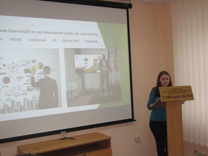 Кафедра соціально-економічних дисциплін Сумської філії Харківського національного університету внутрішніх справ провела для студентів круглий стіл на тему «Формування організаційно-економічного механізму залучення інвестицій до регіону». До студентів-гуртківців звернулася завідувач кафедри Олена Лук’янихіна, яка підкреслила актуальність обраної теми й надала слово для основної доповіді студентці 4 курсу Анастасії Левченко. Також із співдоповідями виступили студенти Неля Чмиркова, Анна Сімашова, Євгенія Зимогляд, Олена Кузьмик.
