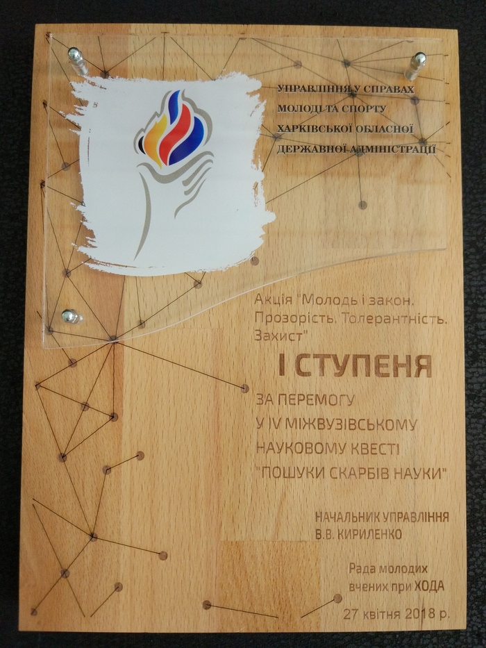 Голова Ради молодих вчених ХОДА, МОЗ, ХНМУ, радник голови Харківської обласної державної адміністрації Наталія Куфтеріна вручила ректору університету Валерію Сокуренку Подяку за підтримку молодіжних ініціатив від Ради молодих вчених та емблему наукового квесту.