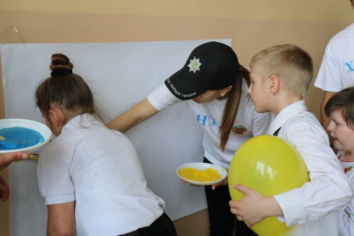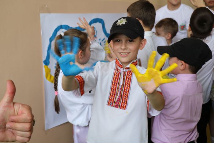Курсанти та студенти поспілкувалися з дітьми, передали подарунки та намалювали разом з вихованцями школи-інтернату велику мапу України.