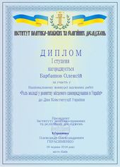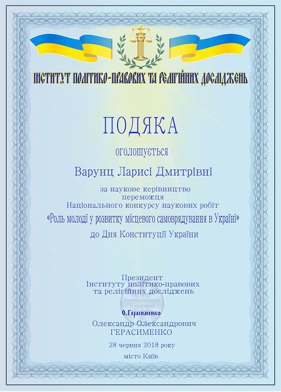 Інститутом політико-правових та релігійних досліджень до Дня Конституції України проведено Національний конкурс наукових робіт «Роль молоді у розвитку місцевого самоврядування в Україні». Національний Конкурс відбувся за підтримки Координаційної ради молодих юристів України при Міністерстві юстиції України, Українського координаційного центру з підвищення правової освіти населення, Координаційної ради молодих юристів міста Києва при Печерському районному відділі державної виконавчої служби міста Києва Головного територіального управління юстиції у місті Києві.