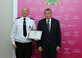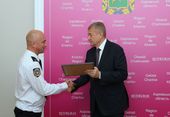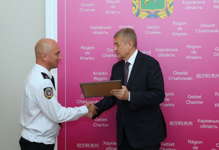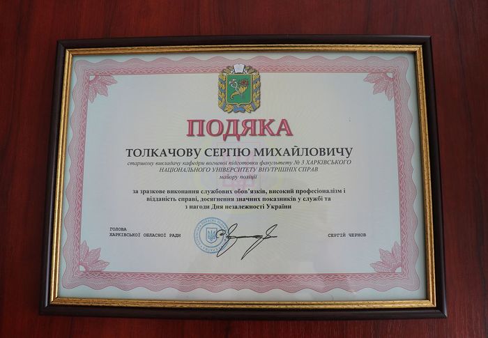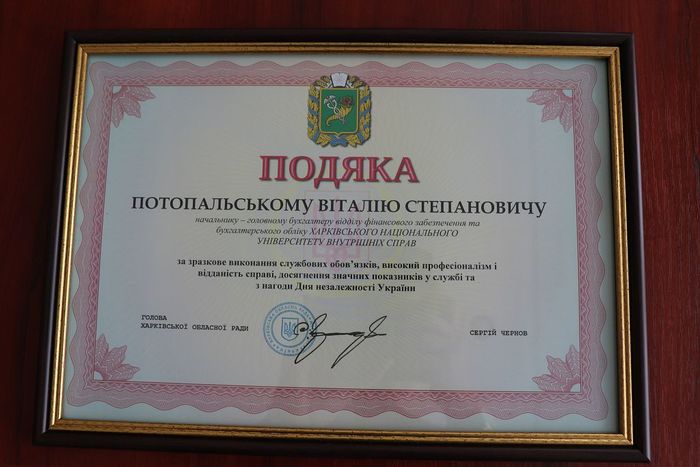З нагоди Дня Незалежності України Голова Харківської обласної ради Сергій Чернов відзначив Почесними грамотами працівників Харківського національного університету внутрішніх справ – начальника та головного бухгалтера відділу фінансового забезпечення та бухгалтерського обліку Віталія Потопальського, старшого викладача кафедри вогневої підготовки майора поліції Сергія Толкачова, провідного фахівця відділу організації служби майора поліції Віталія Іванова.