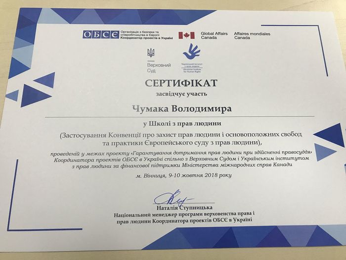 Представник Харківського національного університету внутрішніх справ провідний науковий співробітник відділу організації наукової роботи, кандидат юридичних наук Володимир Чумак взяв участь у дводенному тренінгу Школи з прав людини, який проходив у м. Вінниця. Тренінг проводився Координатором проектів ОБСЄ в Україні спільно з Верховним Судом України, Інститутом з прав людини за фінансової підтримки Міністерства Міжнародних справ Канади (Global Affairs Canada) у межах проекту «Гарантування та дотримання прав людини при здійсненні правосуддя».