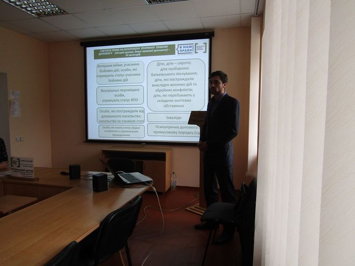На базі Сумської філії Харківського національного університету внутрішніх справ локальний осередок ELSA Sumy провів зустріч з представником Регіонального центру з надання вторинної правової допомоги на тему «Система БВПД Сумщини – на захисті прав людини». Спікером виступив начальник відділу організації надання безоплатної вторинної правової допомоги Регіонального центру з надання вторинної правової допомоги у Сумській області Володимир Жалковський.