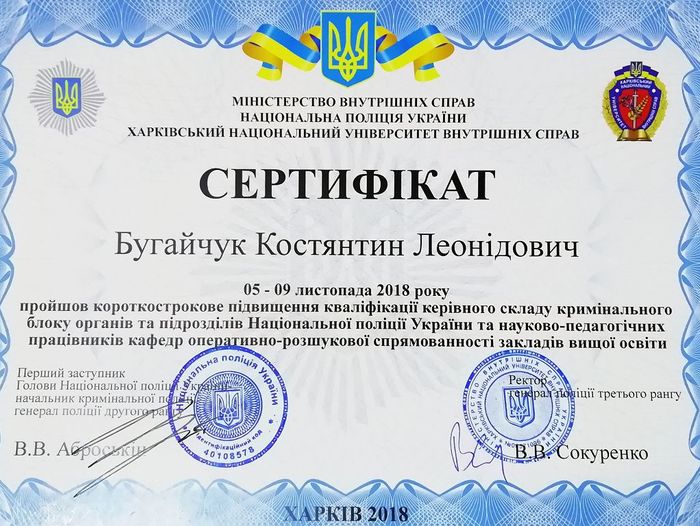 По закінченні курсів слухачі успішно пройшли тестування та отримали сертифікати, які вручили перший заступник Голови Національної поліції України – начальник кримінальної поліції генерал поліції другого рангу В’ячеслав Аброськін та ректор Харківського національного університету внутрішніх справ генерал поліції третього рангу Валерій Сокуренко. В’ячеслав Васильович відмітив високий рівень організації навчання, подякував ректору та колективу університету і підкреслив, що такі курси підвищення кваліфікації для працівників практичних підрозділів Національної поліції будуть проводитися й надалі.