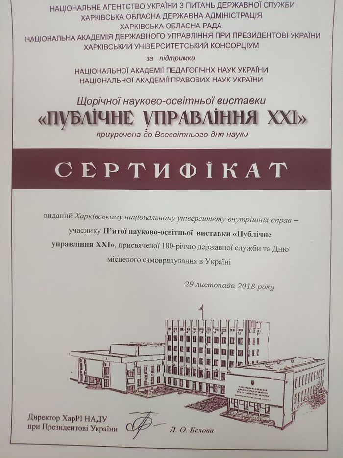 Харківський національний університет внутрішніх справ став учасником п’ятої щорічної науково-освітньої виставки «Публічне управління XXI», яка була присвячена 100-річчю державної служби та Дню місцевого самоврядування в Україні. Вона відбулася у Харківському регіональному інституті державного управління Національної академії державного управління при Президентові України.