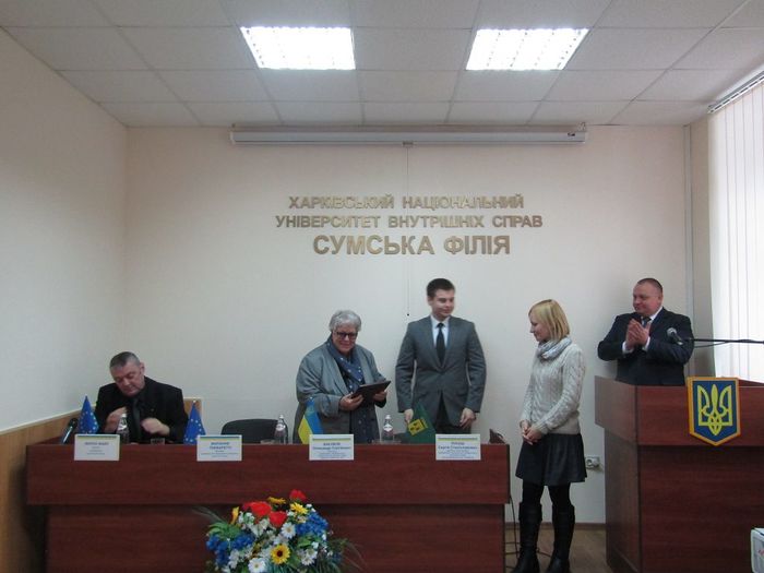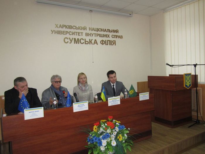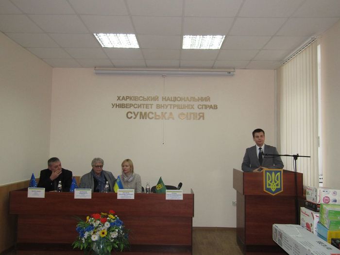 Сумську філію Харківського національного університету внутрішніх справ відвідали президент швейцарського благодійного об’єднання «Help-Point Sumy» з міста Волен, у минулому – мер міста Волен Маріанне Піффаретті та керівник швейцарської регіональної поліції Марко Файл. Їх привітали проректор університету Олександр Бакумов та директор Сумської філії ХНУВС Сергій Лукаш.