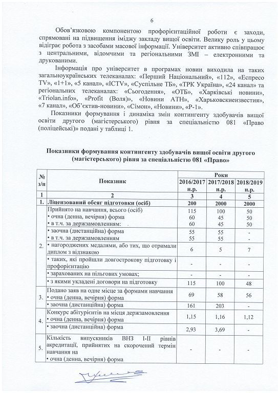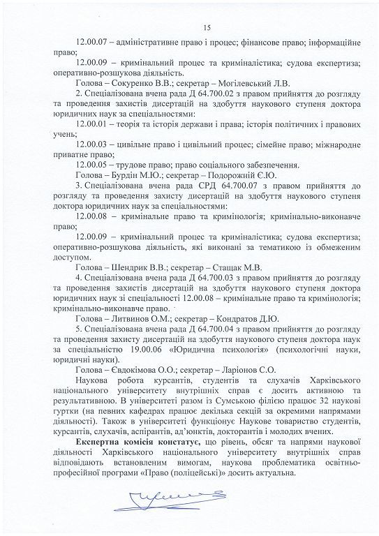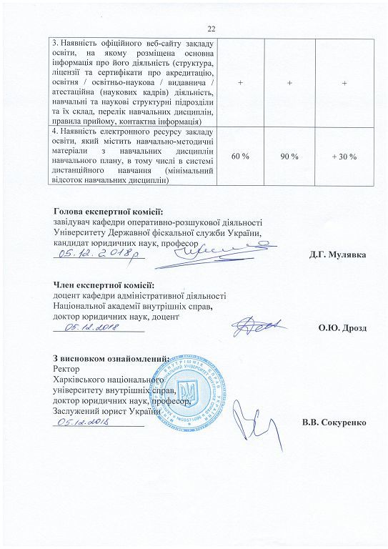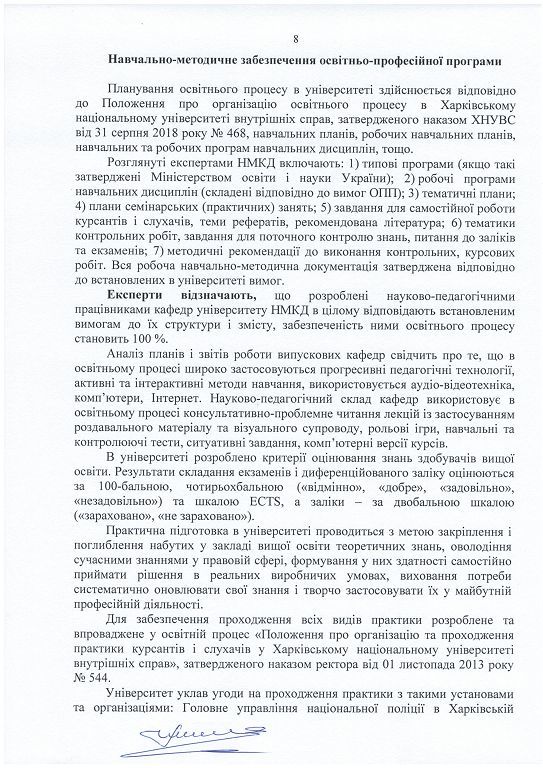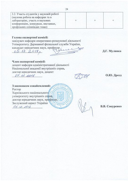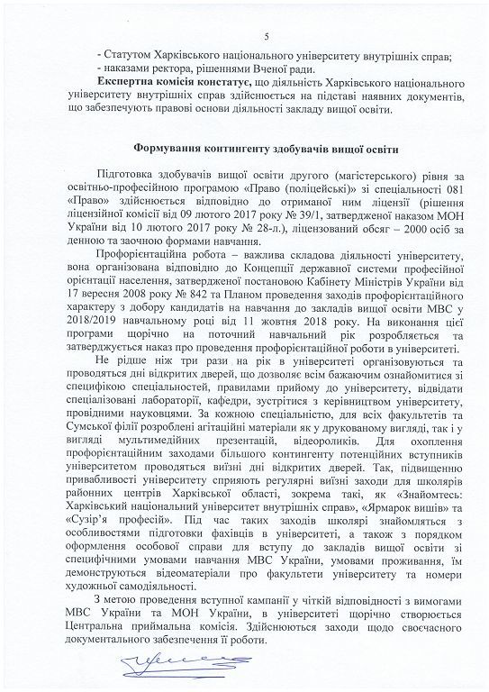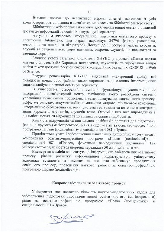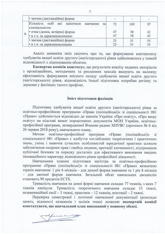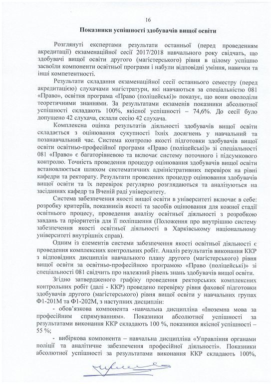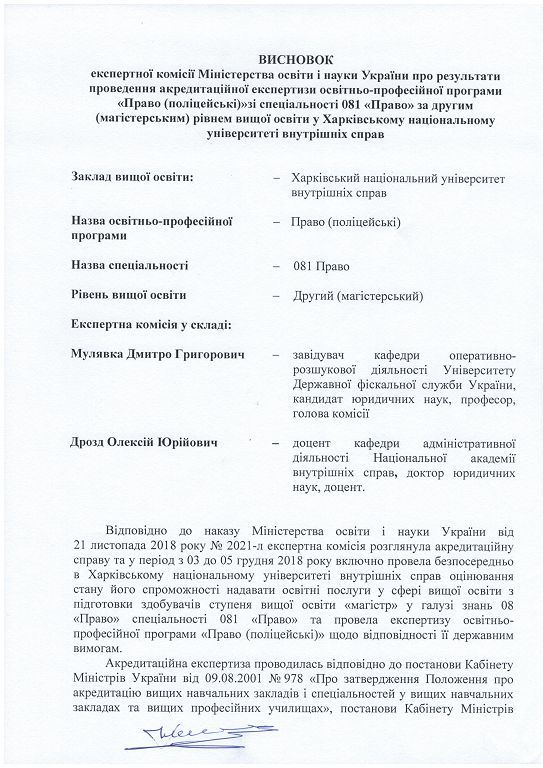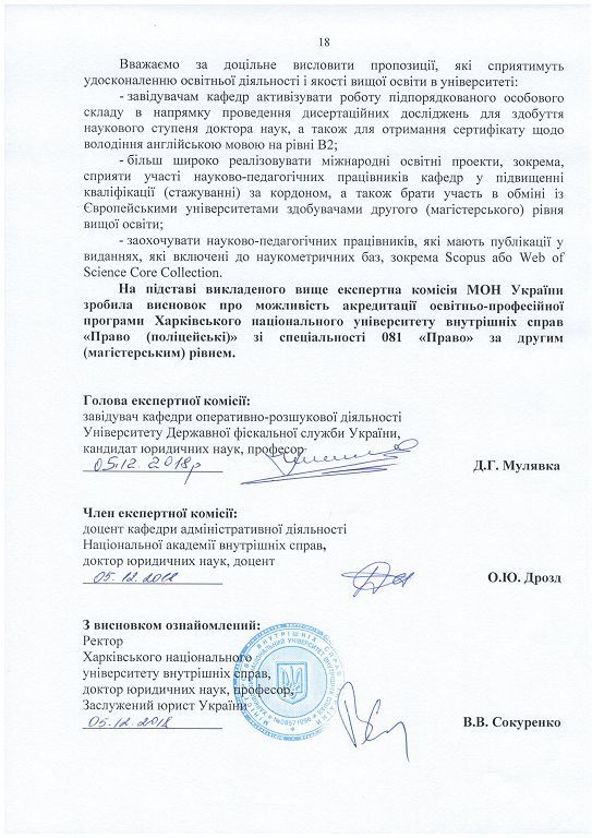 Відповідно до Наказу Міністерства освіти і науки України «Про проведення акредитаційної експертизи» від 21 листопада 2018 року № 2021-л у Харківському національному університеті внутрішніх справ експертна комісія МОН України в період з 3 грудня по 5 грудня 2018 року включно проводила первинну акредитаційну експертизу освітньо-професійної програми Право (поліцейські) зі спеціальності 081 Право. Результатом роботи стало підписання експертною комісією висновку про можливість акредитації освітньо-професійної програми Харківського національного університету внутрішніх справ Право (поліцейські) зі спеціальності 081 Право за другим (магістерським) рівнем вищої освіти.